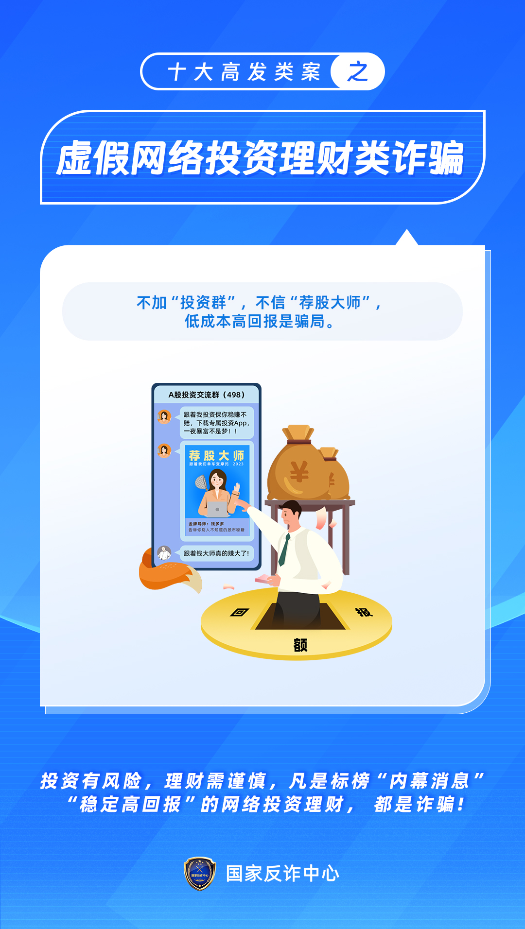 十大高發(fā)類案之虛假網(wǎng)絡(luò)投資理財(cái)類詐騙 發(fā)布時(shí)間:2023年07月04日 08時(shí)47分 作者:管理員 來(lái)源:本站 上一條:十大高發(fā)類案之刷單返利類詐騙下一條:十大高發(fā)類案之虛假網(wǎng)絡(luò)貸款類詐騙