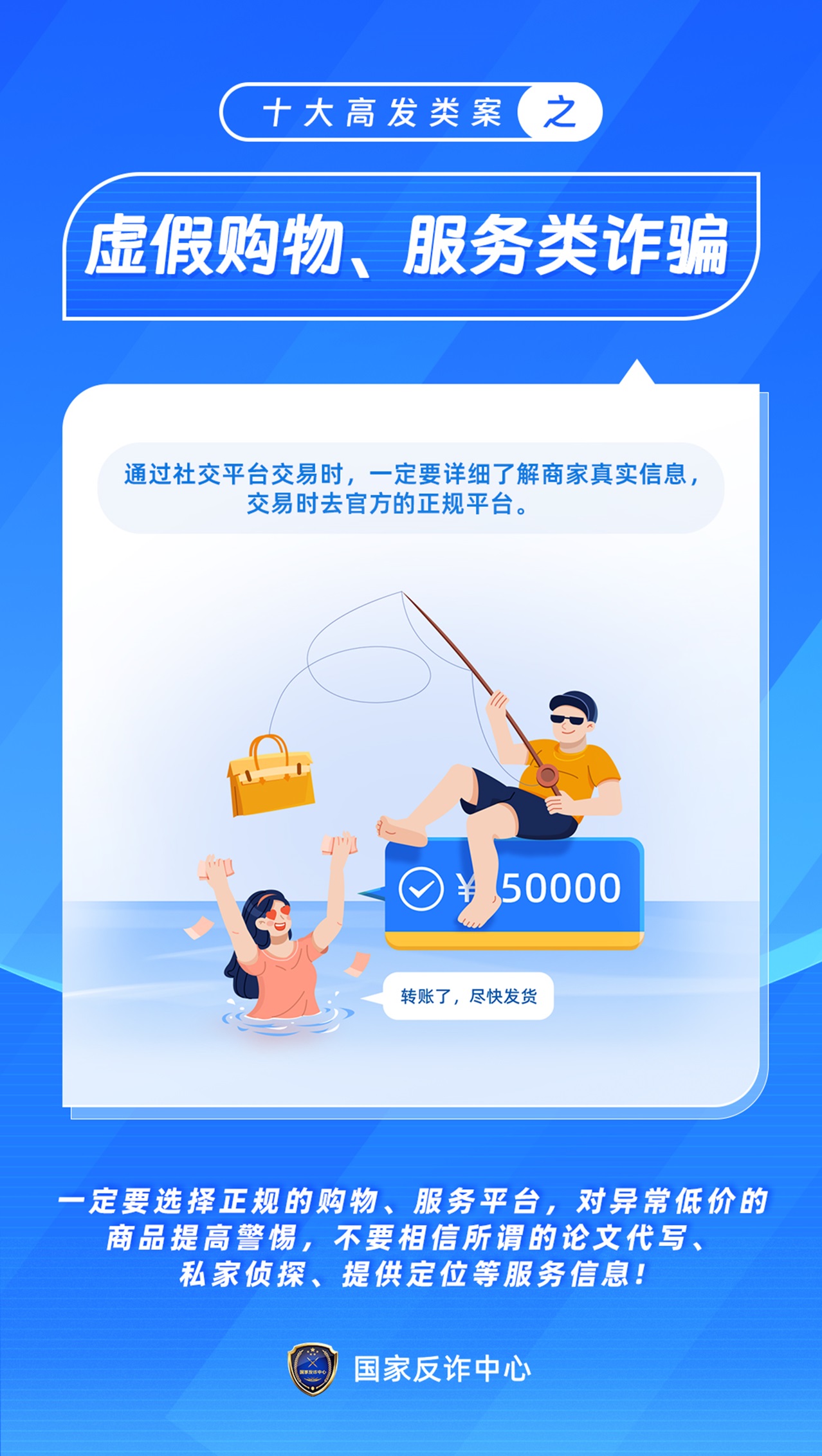 十大高發(fā)類案之虛假購物、服務(wù)類詐騙 發(fā)布時間:2023年07月04日 08時52分 作者:管理員 來源:本站 上一條:十大高發(fā)類案之虛假征信類詐騙下一條:十大高發(fā)類案之冒充領(lǐng)導(dǎo)、熟人類詐騙